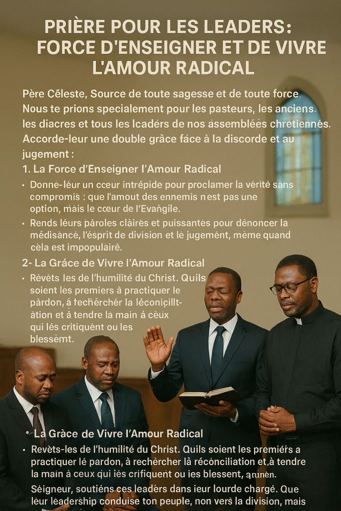 Nous te prions spécialement pour les pasteurs, les anciens, les diacres et tous les leaders de nos assemblées chrétiennes.